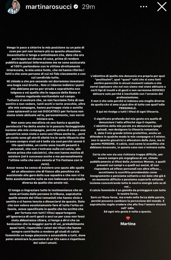 Martina Rosucci fa chiarezza con un lungo messaggio Instagram, tornando sui fatti del Tre Fontane ai danni di Montemurro dopo il triplice fischio di Roma Juventus Women.