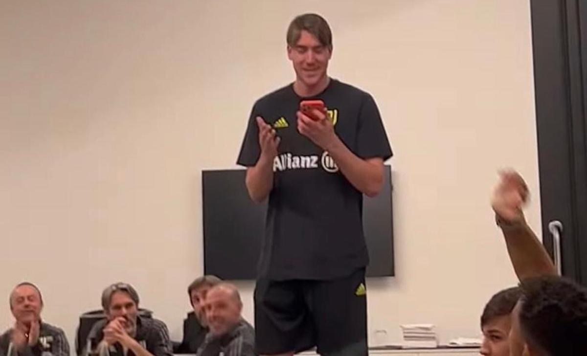 Vlahovic Juve, rito di iniziazione per il serbo: canta davanti ai compagni – VIDEO