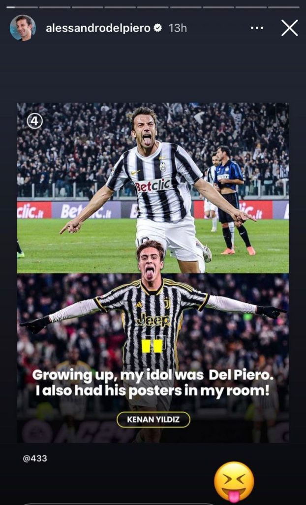 Il numero 15 bianconero ha come idolo l’ex capitano della Juventus Alessandro Del Piero, motivo per cui festeggia come il numero 10, con quella famosa lingua. E Del Piero lo omaggia cosi sulle sue storie Instagram.